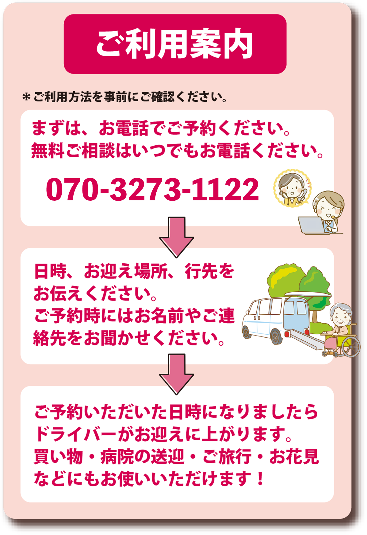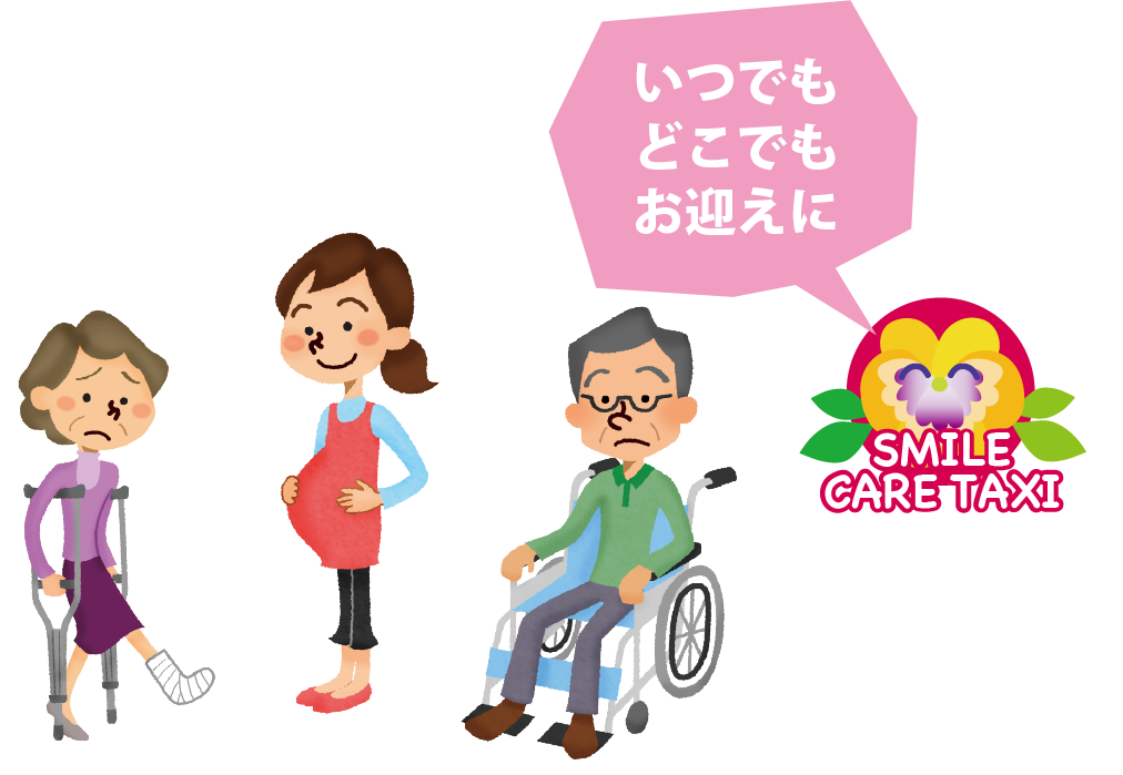 スマイルケアタクシーは、安心・丁寧をモットーに普段の生活の移動をより便利に、より豊かになるよう心を込めてお出かけをサポートいたします。ぜひ、ご利用ください。